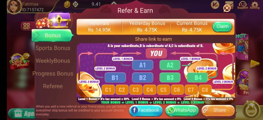 3 Patti Flying Chess is an exciting earning game designed specifically for players in Pakistan. It blends the excitement of Teen Patti with strategic gameplay elements, offering you opportunities to earn real money through daily bonuses, weekly rewards, and an inviting referral system. Earn while you play and invite your friends to join the fun.
